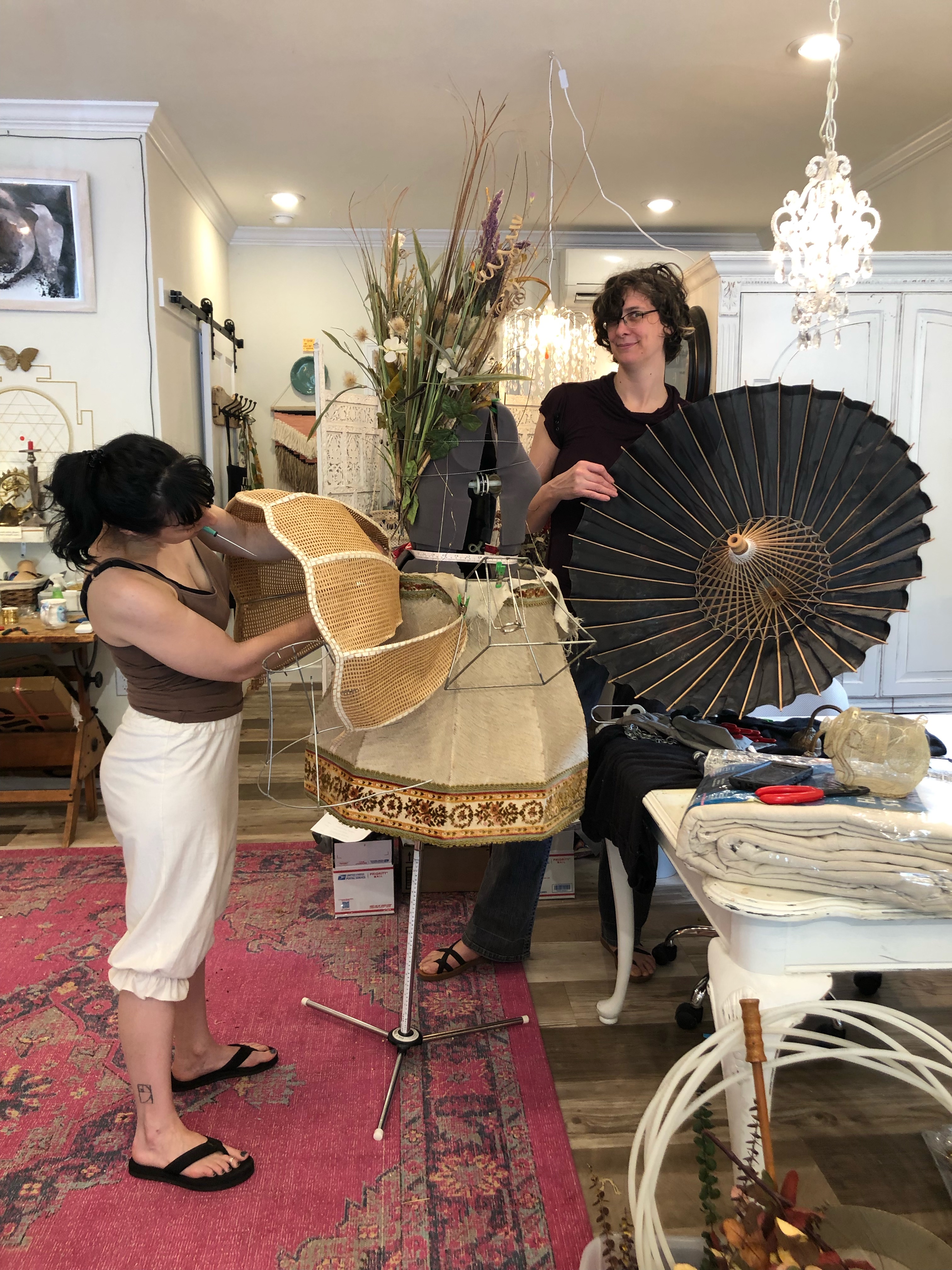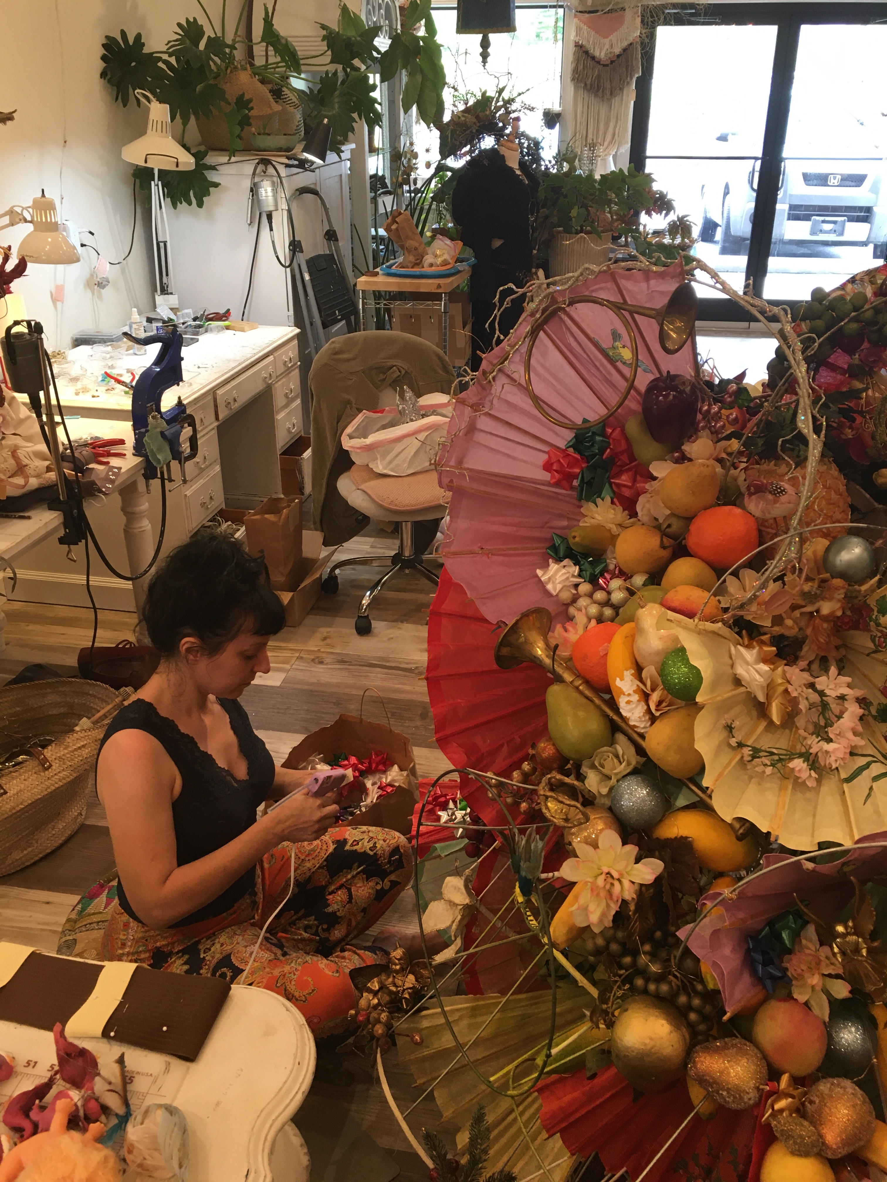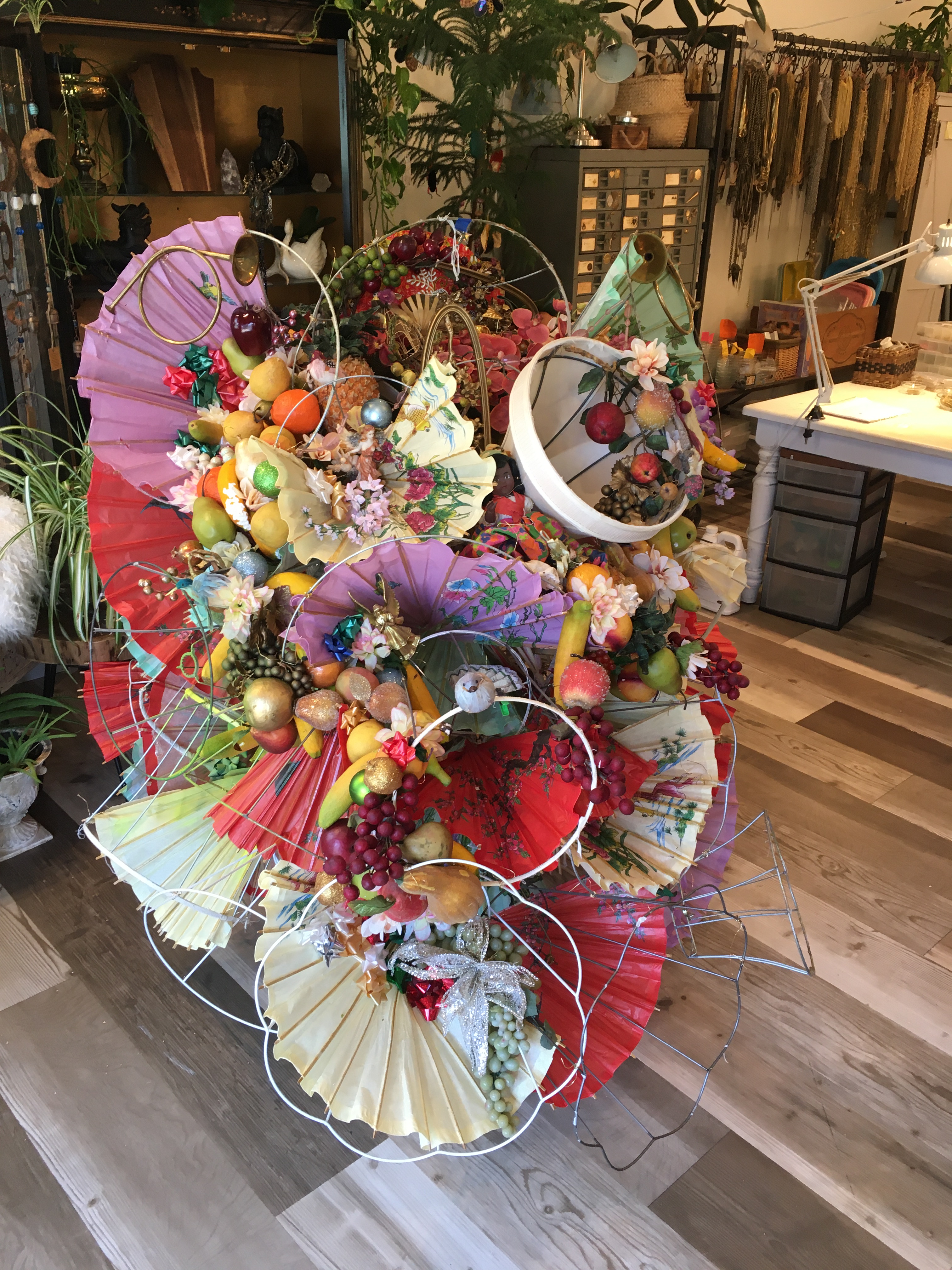 The Junk angel came into being with our assistance springing from the chaos of creation given shape by our found materials. we took inspiration from two pieces of art at the Asheville Art Museum. For Every Women I Have Seen Parts of Africa’s Dream in Her Honor, 1993 by Lonnie B. Holley and Wall Circle 1,1972 by Sam Gilliam.